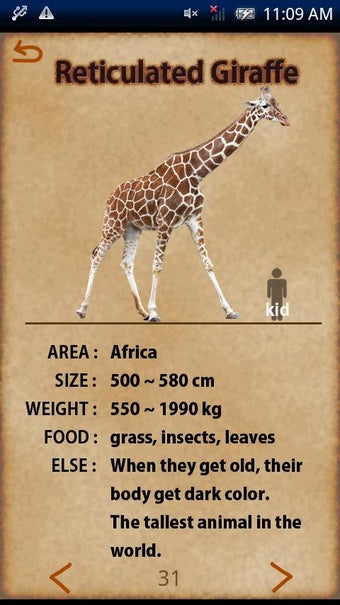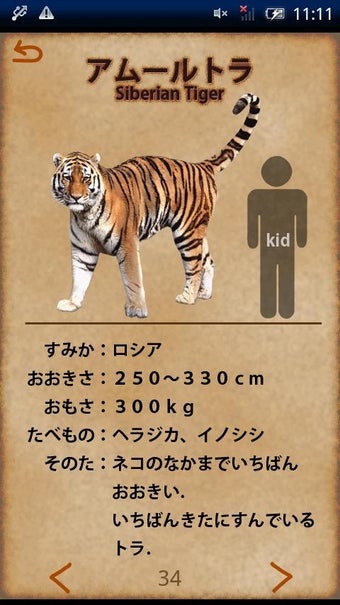 メニューの「どうぶつコレクション」では世界中に生息する動物の図鑑が見られます。110~120cmほどの子どものサイズを基準に大きさを表し、説明もひらがな表記でわかりやすいので、子どもでも動物のことを楽しんで学べそうなデザインだと感じました。